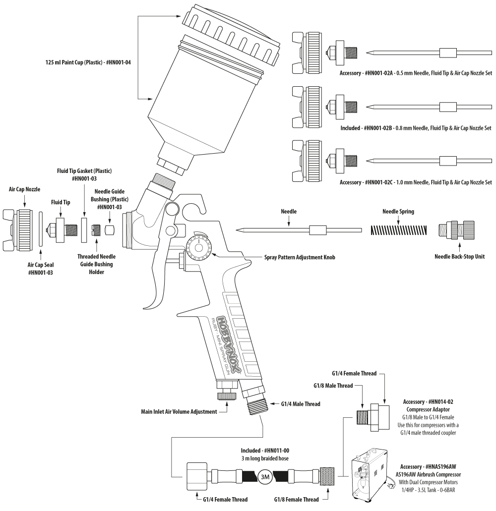 RUBY är en komplett uppsättning som är klar att användas och den går lätt att ansluta till AS196AW Hobbynox Airbrush Compressor eller någon annan större luftkompressor med ett luftfilter som har en G1 / 8 BSP gängad koppling.