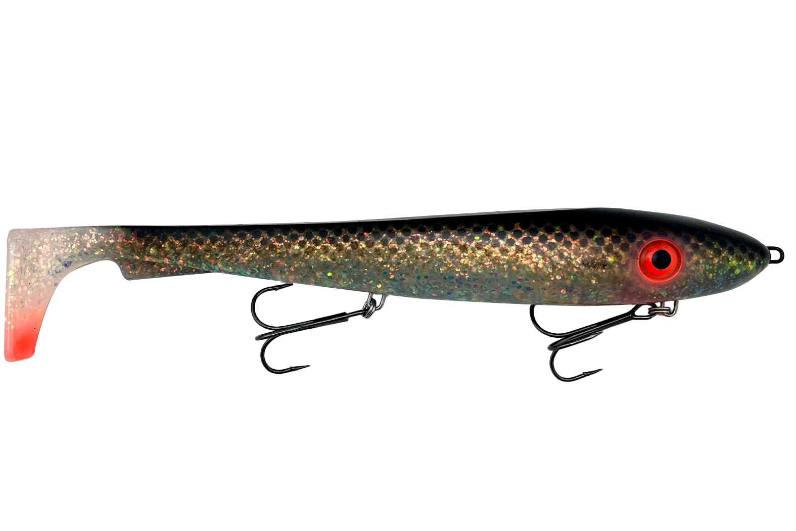 McRubber XL är den yngsta och absolut största meddlemmen i McRubber familjen.Med sina 30 cm och en ordentligt bred profil syns betet på långt håll och kommer inte lämnas ifred av hungriga predatorer! Betet paddlar förföriskt redan vid låga hastigheter och rörelser från paddeln förs fram genom betet och ger McRubber XL det där äkta ”storfiskgunget”.Denna variant av McRubber XL är försedd med en genomgående 1,5mm vajer och två stycken 5/0 tre-krok vilket gör att du kan fiska betet direkt ur förpackning.